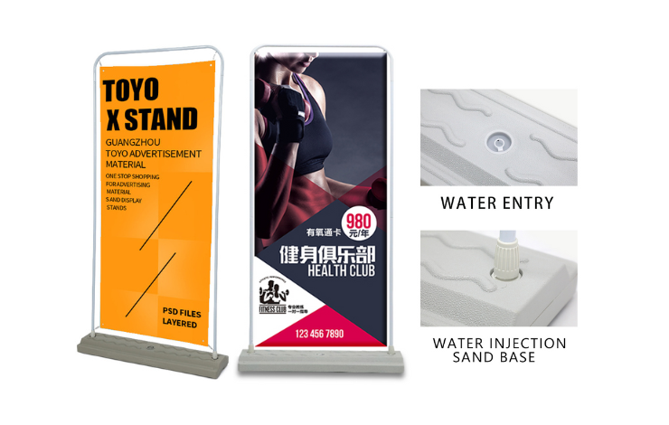 Sản phẩm này có đặc điểm nổi bật là phần đế có thể chứa nước. Điều này giúp tăng trọng lượng cho phần chân đế tạo độ vững chắc cho khung standee. Với trọng lượng tối đa sau khi đổ đầy nước là khoảng 14kg rất thích hợp khi trưng bày nơi không gian rộng và nhiều gió. Banner standee cản gió có thể dùng giấy PP hoặc bạt Hiflex và đóng khoen 4 góc. Sản phẩm được ưa chuộng cho tổ chức sự kiện ngoài trời, nhà hàng, khách sạn, hội nghị, hội thảo,… Mục đích nhằm truyền đạt thông tin đến khách hàng rõ ràng và rộng rãi hơn so với việc quảng cáo trong nhà.